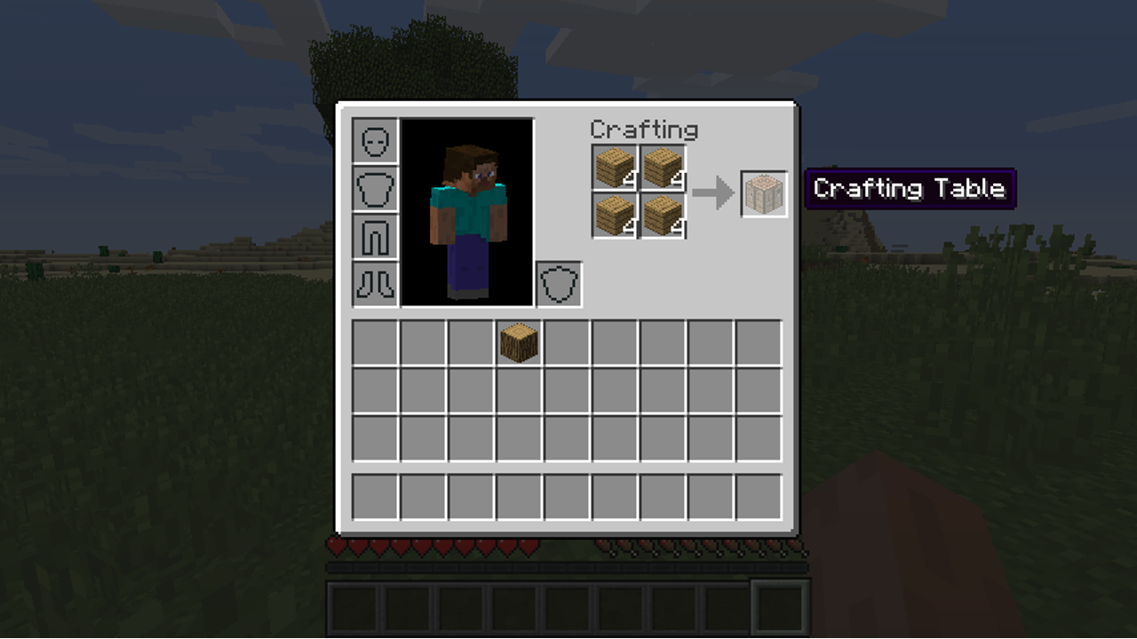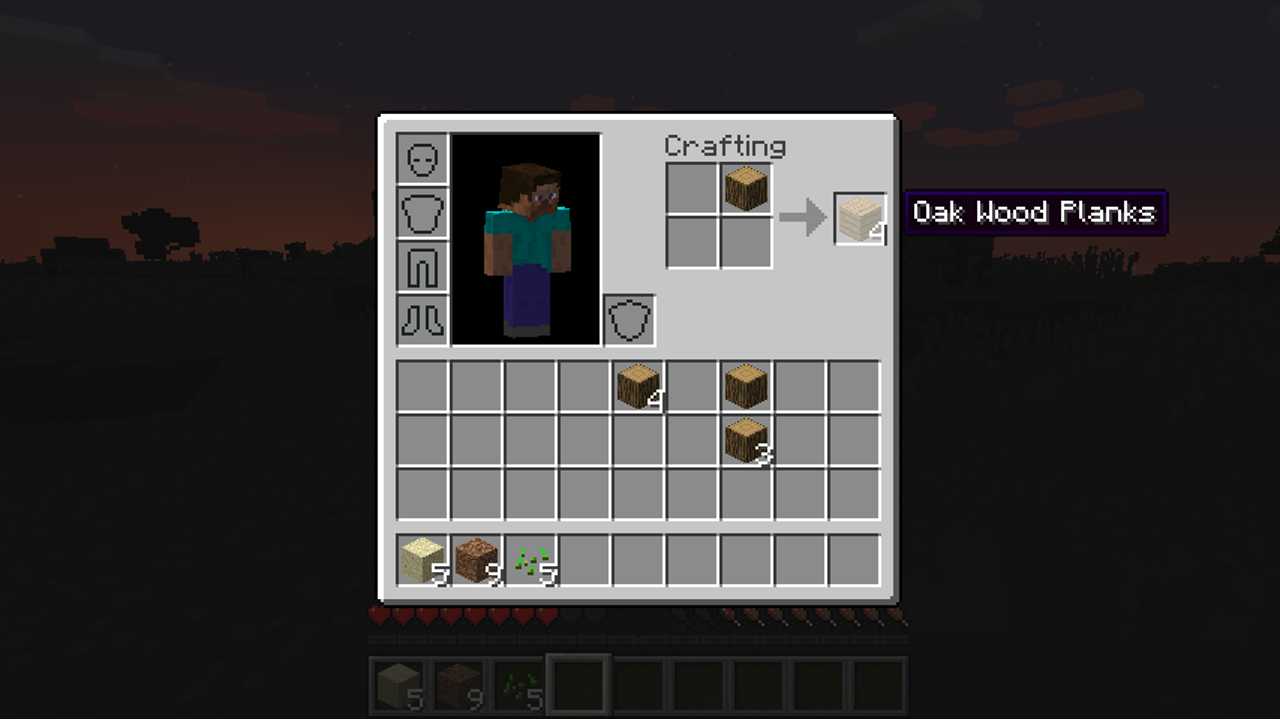 Now open your inventory screen. Here you'll find everything you pick up in the world. Those four squares in the top right are your personal crafting area. Drag some of that wood over into a crafting area square. Four wood planks will appear in a fifth square. Drag them into your inventory and they're yours!