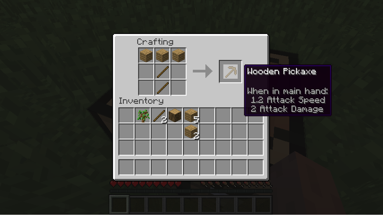 Keep crafting wood until you have four planks. Then, put all of these in your crafting area to get a crafting table. You can now drag your crafting table to your toolbar, allowing you to hold it in your hands and place it in the actual world! Just stroll up to it and use it - a new (and better!) crafting window will pop up. Here, you'll be able to craft more complex recipes thanks to its wider 3x3 grid. 'Recipes' are the mixture of items you need to create stuff. E.g. the recipe for a pickaxe is two sticks and three planks: